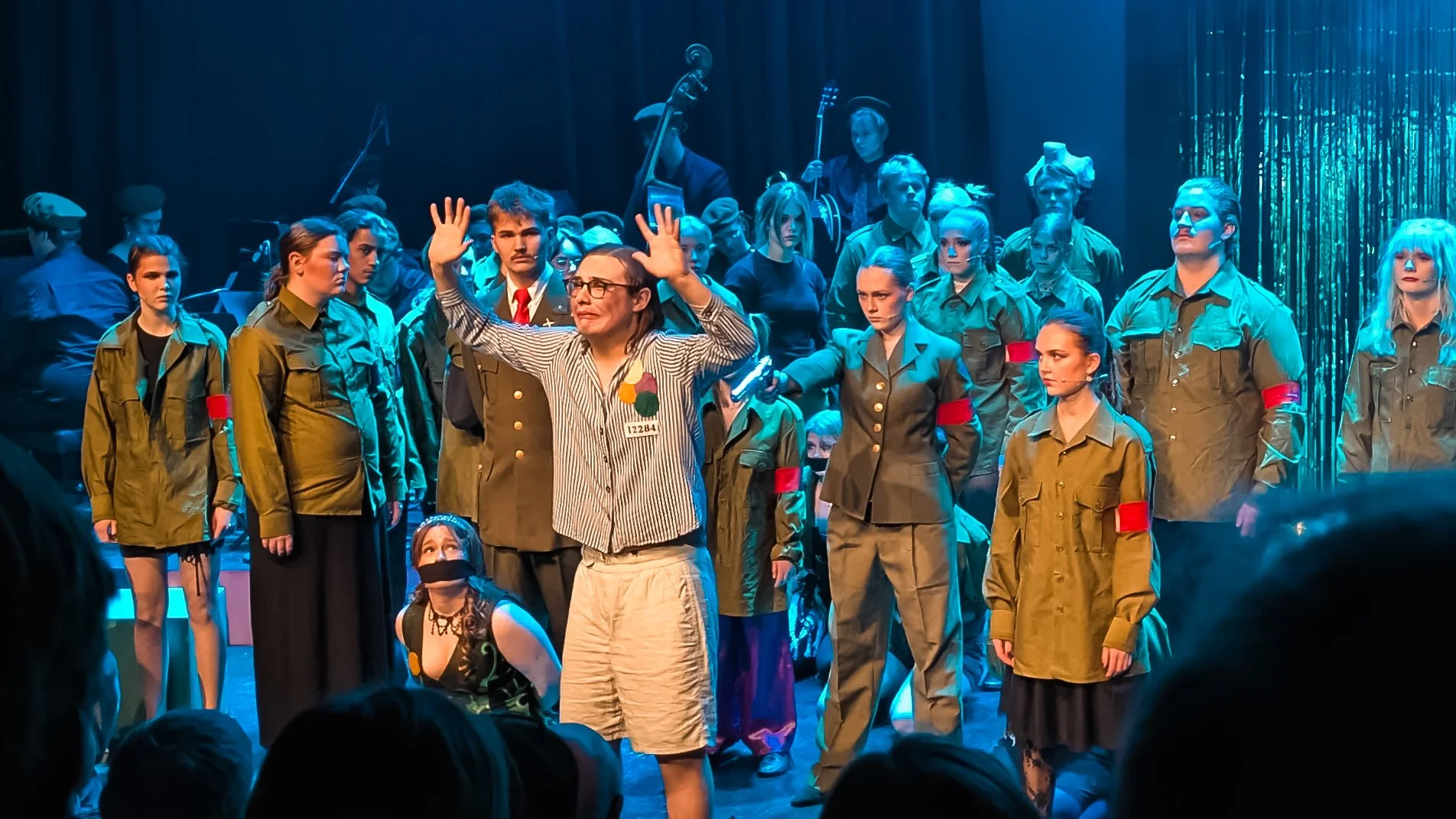 I andre akt strammes grepet ytterligere. Det visuelle uttrykket mørkner, både bokstavelig og tematisk, når ensemblet trer frem i grønne, militærinspirerte uniformer – én av dem med noe så arkaisk som en sigarett i munnviken, et lite, men effektivt grep som forsterker krigsstemningen. Den lekne cabaret-estetikken fra Kit Kat Klub får en kjøligere, mer autoritær tone, og forestillingen beveger seg tydelig mot et politisk alvor. Replikker som «det er bare politikk, hva har det med oss å gjøre – det ordner seg», får vi høre mot slutten av stykket. Det treffer ekstra hardt i dagens verdensbilde, også sett i lys av norsk samtid. Forestillingen minner oss om hvor galt det kan gå når makt får vokse uten at moralsk og etisk ansvar følger med. Elevene ved musikklinja Molde vgs formidler dette ubehagelige budskapet på en levende, kreativ og elegant måte.