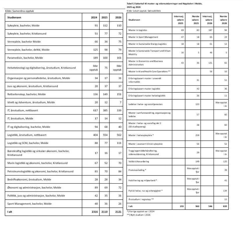Tabellene viser utviklingen i søknadsmassen til de forskjellige studieretningene ved Høgskolen i Molde se seneste tre årene.