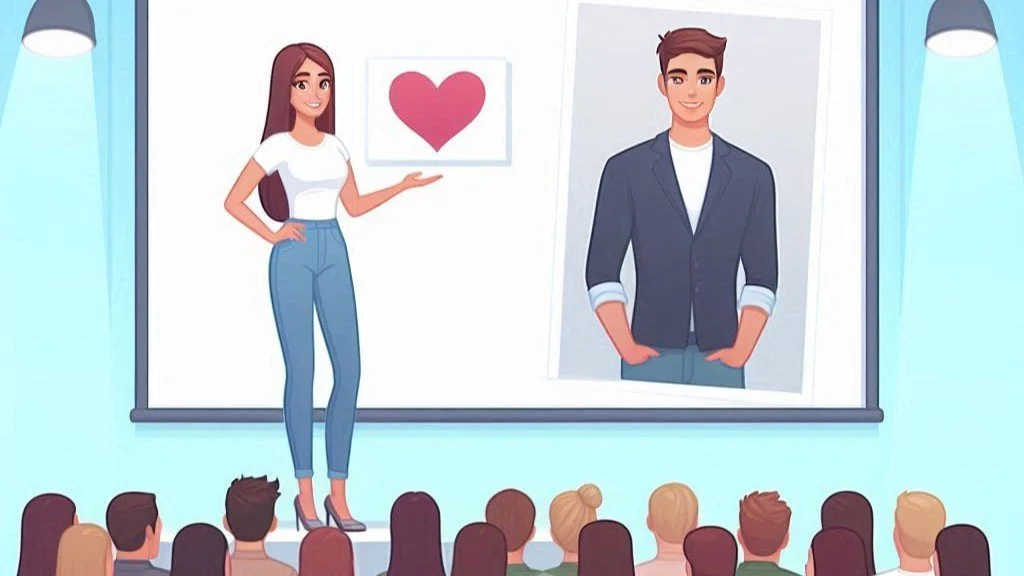 Illustrasjonen er AI-generert med følgende prompt: “Da kan jeg tenke meg et foto av en kvinne som står på en scene og på en storskjerm presenterer en person hun kjenner som hun vil skal finne seg en kjæreste. I salen sitter rundt 20 personer og hører på henne.”