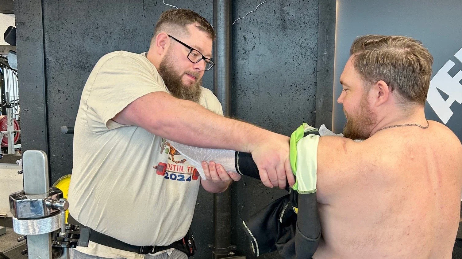 Under oppvarmingen tok utøverne på seg konkurransedrakt og benkpresskjorte. Dette er spesialsydde plagg som gir ekstra støtte og stabilitet, og som gjør det mulig å løfte tyngre vekter – men de stiller også høyere krav til teknikk.