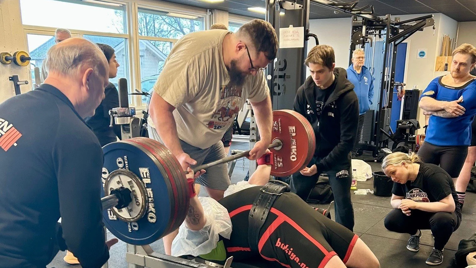 Det er mange i sving under et løft. Tre dommere og fem stk sikrer. Foto. Malin Johannessen.