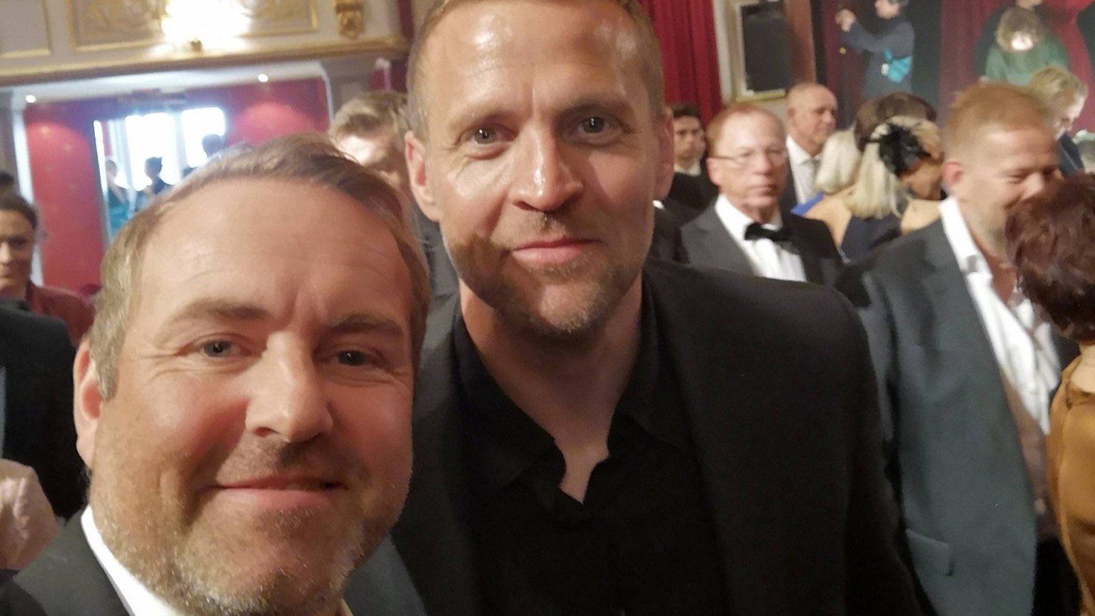 Noen av stjernene kommer man tettere innpå enn andre, forteller Robin. Her er han i alle fall ganske tett på hovedrolleinnehaver Tobias Santelmann under innspillingen i Drammens Teater. Foto: Privat.