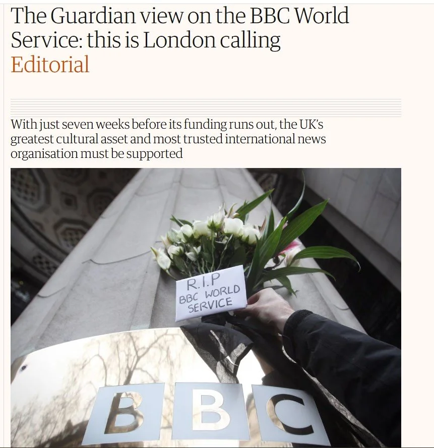 Det er den britiske avisen The Guardian som i en leder publisert fredag kveld skriver at BBC World Service om syv uker vil være tom for penger, og etter den tid vil trenge tilførsel av nye midler for å kunne videreføre sendingene sine.